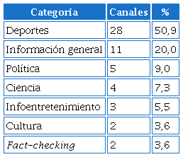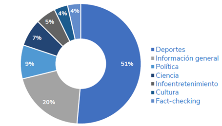 Dentro de la diversidad de iniciativas informativas en Twitch, predomina la oferta deportiva (Tabla 6) junto a canales generalistas, especializados en política, ciencia, cultura o fact-checking, así como canales enfocados plenamente en el infoentretenimiento. El análisis de los contenidos que incorporan los diferentes medios y periodistas en sus emisiones permite apreciar un claro predominio de formatos sobre actualidad de una temática concreta, ya sea con invitados expertos o en conversación con los espectadores. En menor medida se emplean los directos para retransmitir eventos -como las conferencias de elDiario.es o los lanzamientos espaciales de C de Ciencia- o emisiones de programas procedentes de otros soportes en forma de “radio visual”-como El Ágora de Hora 25 de la Cadena SER o Tiempo de Juego de la COPE-.