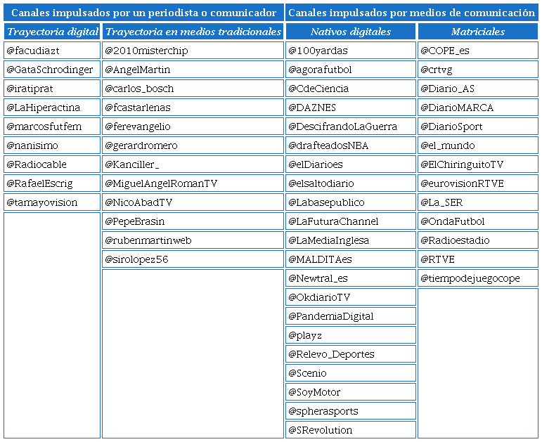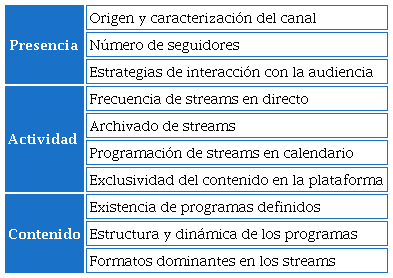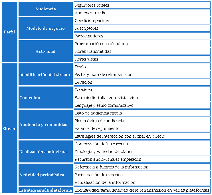 En la segunda fase, se aplica una ficha de análisis (Tabla 1) sobre la muestra, entre el 5 y el 19 de abril de 2023, observando las características propias de los streams (en directo durante el periodo de análisis y los archivados) de los canales periodísticos identificados en la plataforma. Como consecuencia, se establece una categorización diferenciando canales impulsados por periodistas o comunicadores y por medios, así como un segundo nivel según la trayectoria previa (Tabla 2) -en el caso de profesionales a título individual, principalmente digital o derivada de medios y soportes tradicionales; para medios, nativos digitales o matriciales-.