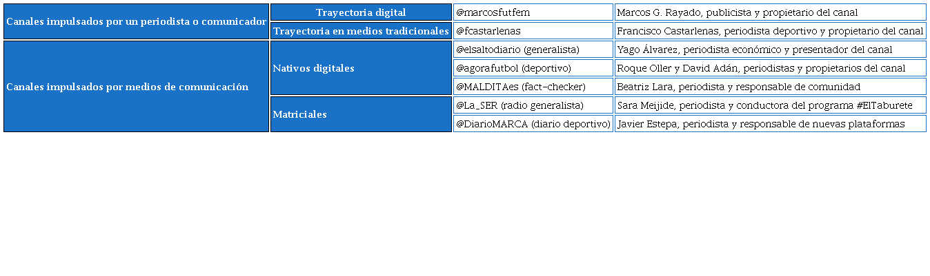 Otro de los aspectos destacados que se pueden extraer de este estudio exploratorio es la apuesta mayoritaria por una imagen principal para los canales por medio de un único profesional -como elDiario.es con Ignacio Escolar- o por un grupo reducido de protagonistas -por ejemplo, Diario AS (Tomás Roncero, Pepe Brasín, Alba López o Juanma Rubio) o CRTVG (Esther Estévez, Gabriel Fuentes, Yaiza López o Merce Silva, entre otros)-. Una breve indagación sobre el origen y la trayectoria profesional de estas figuras muestra un grupo mayoritario de profesionales que compaginan su trabajo en Twitch con la actividad -en muchos casos de amplio recorrido- en medios y soportes de comunicación tradicionales como la radio o la prensa. También se observa a un conjunto de comunicadores con presencia dominante en entornos digitales, tanto profesionalmente ligados al periodismo -Carles Tamayo o Ágora Fútbol- o procedentes de otros sectores -Marcos G. Rayado, publicista, o La Hiperactina, graduada en Ciencias Biomédicas-.