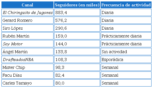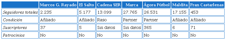 Uno de los principales aspectos que es necesario abordar es el económico-financiero. Los datos recogidos muestran cómo sólo dos de los canales estudiados -Marca y Ágora Fútbol- tienen la condición de partner que les permite obtener un mayor beneficio por las suscripciones, ya que por patrocinios ninguna de las cuentas percibe ingresos. Son precisamente estos canales los que tienen un mayor nivel de seguimiento, a pesar de que el volumen de seguidores no implica necesariamente la escalada de rango. Un caso ejemplificador es el de la Cadena SER que, pese a ser el cuarto canal por número de seguidores, se sitúa en el nivel más bajo dentro de la plataforma debido a la escasa e intermitente actividad que desarrolla en ella. Una frecuencia irregular que, según Sara Meijide de la SER, puede estar causada por “el miedo a que sea una moda pasajera y reviente”.
