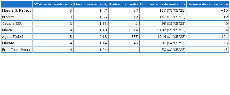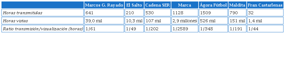 En términos generales, los directos tienen una duración similar (Tabla 9), en torno a la hora y media, con un repunte destacable en el caso de Ágora Fútbol, cuyo programa diario se prolonga por encima de las dos horas. Esta circunstancia coincide con los objetivos marcados por Marcos G. Rayado a corto plazo, con “menos directos y más largos”. Este es uno de los aspectos que forma parte de la estrategia programática que funciona, como mencionan Javier Estepa y Fran Castarlenas, a base de “ensayo y error”.