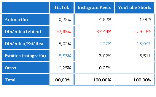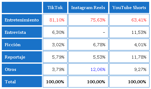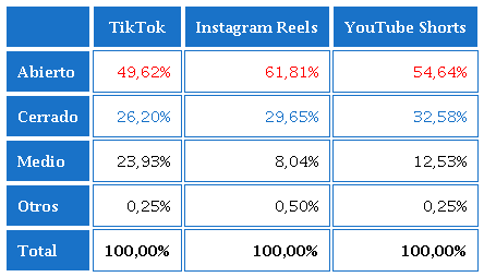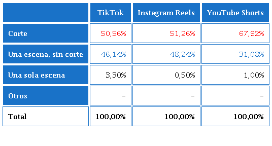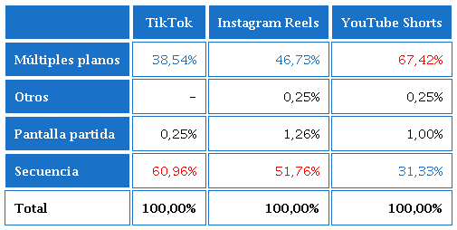 De forma general, se concluye que en TikTok, Instagram Reels y YouTube Shorts los vídeos destacan mayoritariamente por su formato vertical, de los géneros entretenimiento, reportaje y entrevistas, principalmente, grabados a la altura de los ojos, en interiores, con planos abiertos, secuencia y cortes, de una escena, estructura lineal y de orden cronológico; emplean también música, tienen sobreimpresiones en su imagen, y la duración es variable.