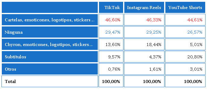 El uso de cartelas, emoticones, logotipos, stickers y subtítulos es una práctica extendida en casi la mitad de los vídeos.
