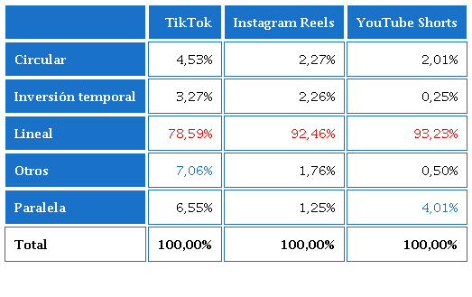 Acerca de las características formales referidas al tiempo de los vídeos en TikTok, Instagram Reels y YouTube Shorts, hallamos que la estructura lineal es tres veces más usada.