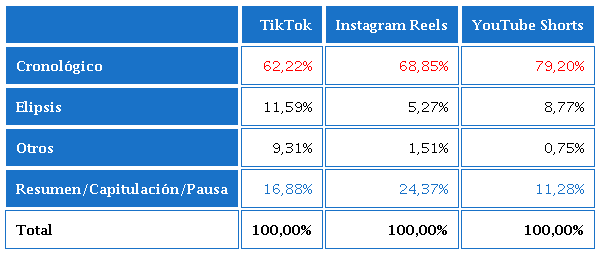 Sobre el orden de los vídeos, la categoría más común es el “Cronológico” en las tres plataformas (TikTok: 62,22%; Instagram Reels: 68,85%; YouTube Shorts: 79,20%), incluso en conjunción con las estructuras “Secuencial”, “Digresión”, etc. La segunda categoría más común es del “Resumen/capitulación/pausa” en las tres plataformas (TikTok: 16,88%; Instagram Reels: 24,37%; YouTube Shorts: 11,28%) (ver Tabla 15).