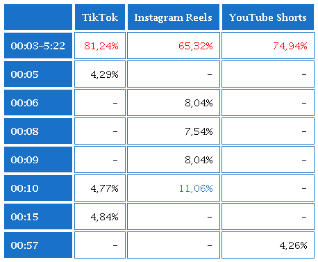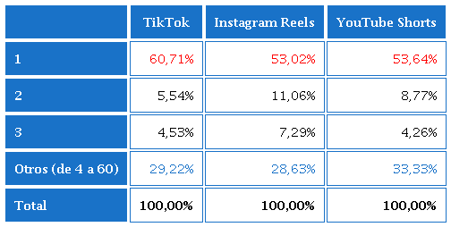 Acerca la duración de los vídeos, se puede decir que es una categoría con resultados dispersos. Es decir, la mayoría de los vídeos analizados tiene una duración que va entre los 3 segundos y los 5 minutos, 33 segundos, en las tres plataformas: TikTok entre “00:03-5:22” (81,24%); Instagram Reels entre “00:03-01:29” (65,32%); YouTube Shorts entre “00:04-01:03” (74,94%). Con “01:00” como segunda categoría predominante coinciden las plataformas TikTok (4,86%) y YouTube Shorts (13,28%) y con “00:10” los vídeos de Instagram Reels (11,06%) (ver Tabla 16).