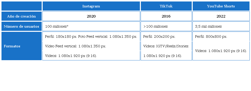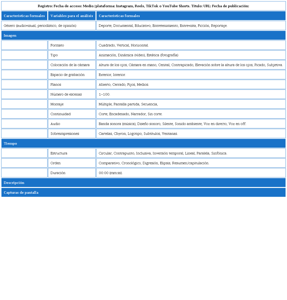 A continuación, se detallan y examinan las características formales y variables de las imágenes de las tres plataformas objeto de estudio: TikTok, Instagram Reels, YouTube Shorts.