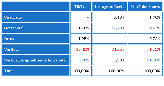 Casi la tercera parte de los vídeos son en formato vertical, siendo en TikTok el formato más común.