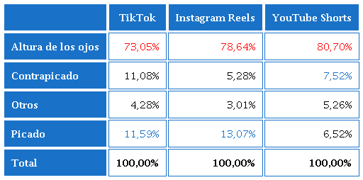 Acerca de la colocación de la cámara, en la mayoría de los vídeos se ha optado por ser grabados a la “Altura de los ojos” en las tres plataformas (TikTok: 73,05%; Instagram Reels: 78,64%; YouTube Shorts: 80,70%), aunque combinado con picados, contrapicados, cenitales, diagonales, etc. En segundo lugar, el “Picado” es la categoría para los vídeos de TikTok (11,59%) -combinado con “Contrapicado”-; mientras que para Instagram Reels (13,07%), el “Contrapicado” es la categoría secundaria mayoritaria en YouTube Shorts (7,52%) (ver Tabla 6).
