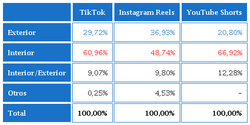Sobre el espacio de grabación, los sets de “Interior” son los principales para TikTok (60,96%), Instagram Reels (48,74%) y YouTube Shorts (66,92%). En segundo lugar, son el espacio “Exterior” para las tres plataformas (TikTok: 29,72%; Instagram Reels: 36,93%; YouTube Shorts: 20,80%), donde también se pueden incluir imágenes de animación (ver Tabla 7).