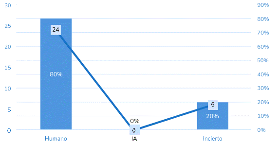 En 24 textos el resultado fue “humano” (80 %), en 6 fue “incierto” (20 %) y en ninguno se detectó claramente IA generativa (0 %) (Figura 2).