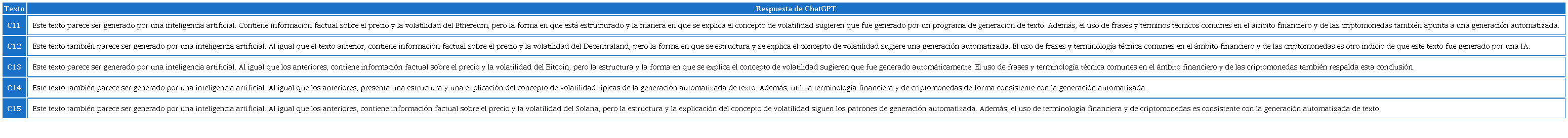 ChatGPT también identificó los 5 textos creados por Gabriele como contenido sintético (Tabla 10).