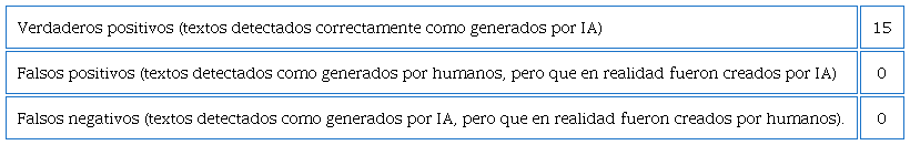Los resultados de las métricas de evaluación para C1-C15 (Tablas 11 y 12) sugieren que ChatGPT 3.5 puede identificar textos generados por IA sin error.