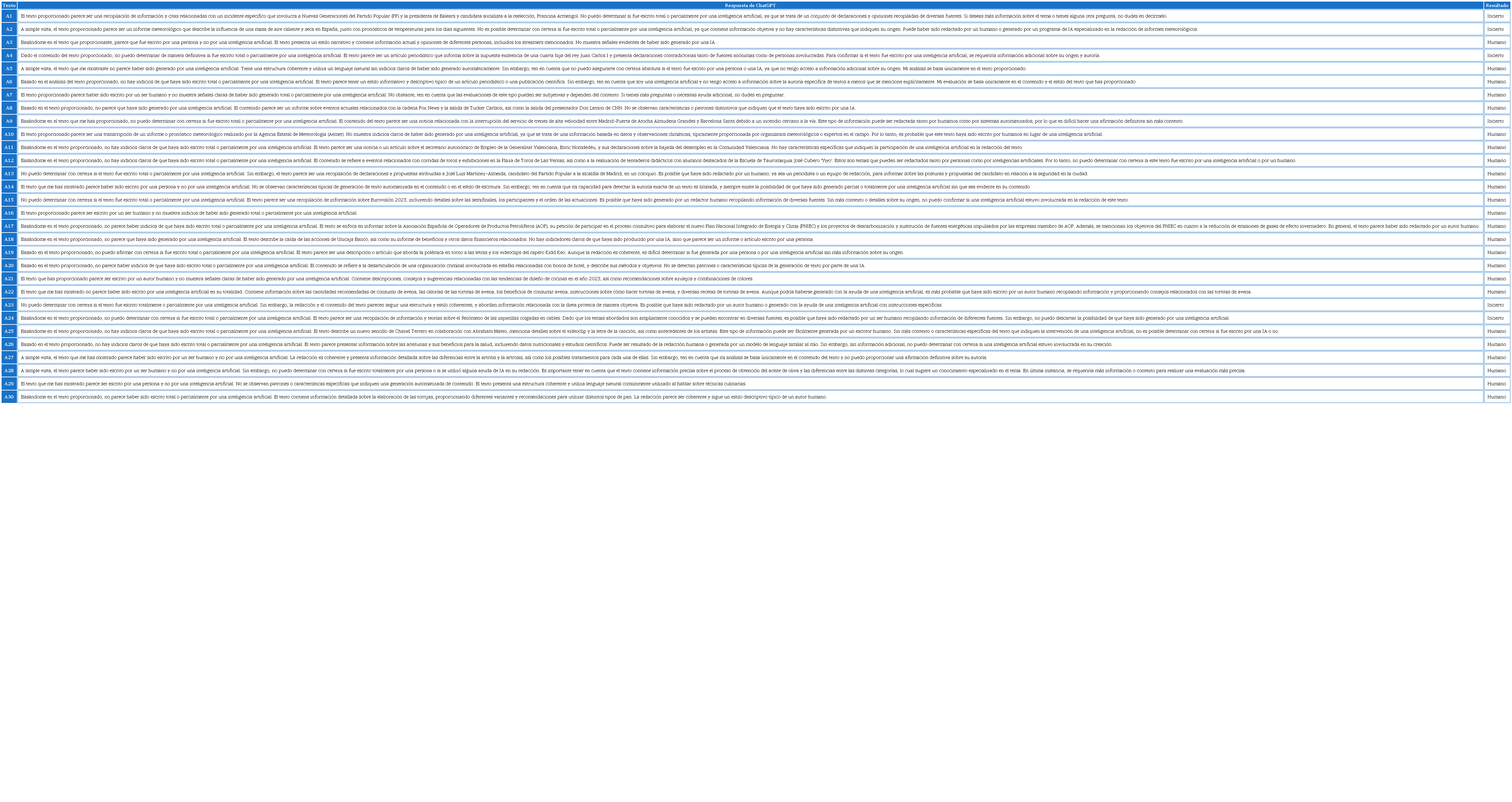 Una vez comprobado que ChatGPT 3.5 ofrece indicios fiables de uso de IA en textos sintéticos, se solicitó al chatbot que valorase los 30 artículos supuestamente escritos por periodistas para de El Mundo y eldiario.es (Tablas 7 y 8). Las respuestas y resultados se recogen en la Tabla 13.