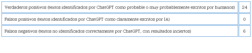 Los resultados son más dudosos o inciertos cuando los textos son, supuestamente, creados por humanos. De los 30 artículos de El Mundo y eldiario.es, ChatGPT devolvió en un 80 % de los casos una respuesta casi segura de que no hubo intervención total o parcial de alguna IA (en el 20 % restante el resultado fue “incierto”), aunque también es destacable que no detectó claramente ningún caso de uso de IA. La puntuación F1 (medida combinada de precisión y exhaustividad) para ChatGPT fue del 88,8 %, un porcentaje considerable y comparable al de detectores de IA sometidos a análisis (He et al., 2023).