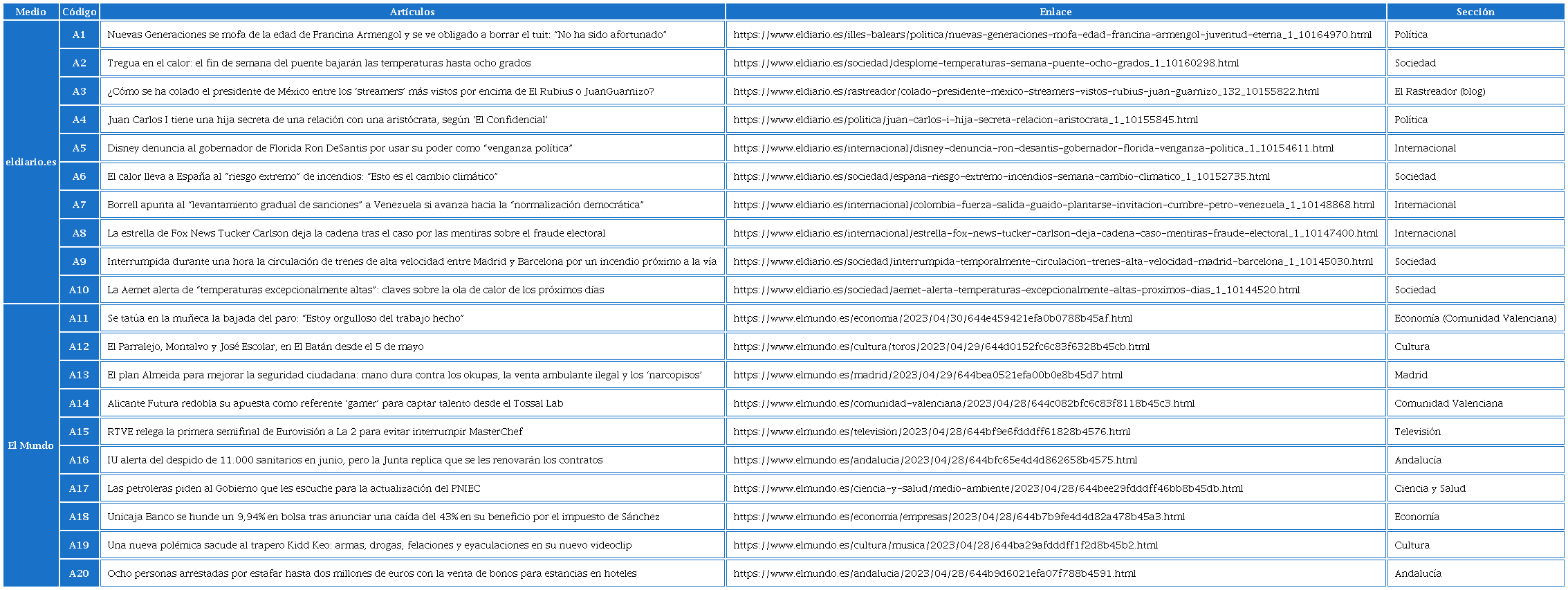 Todos los textos fueron publicados en el período de realización de la encuesta. La selección se hizo por orden cronológico inverso, desde el 30 abril de 2023. A cada texto se le asignó un código (A1, A2, A3...).