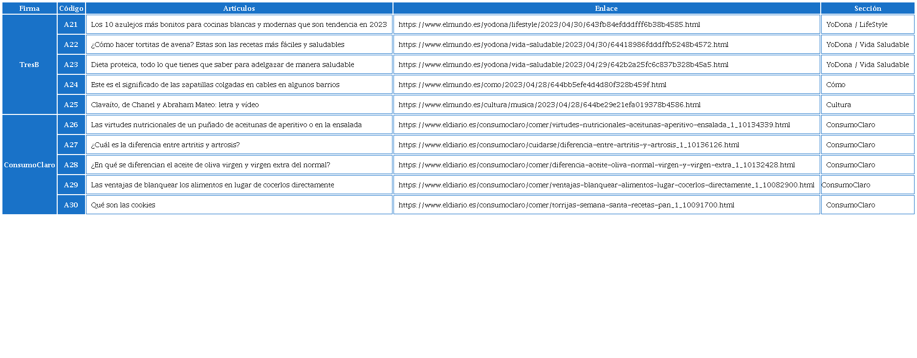7. 10 textos no firmados por periodistas de secciones y firmas seleccionados intencionalmente por entender que su naturaleza informativa es más susceptible de uso de IA generativa (Tabla 8):