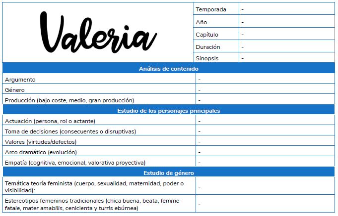 Conscientes de que el concepto “género” asociado a una tipología cerrada ha quedado bastante obsoleto, nuestra intención es situar la ficción con unas características morfológicas (escenarios, personajes, códigos visuales, códigos sonoros, códigos ideológicos y culturales), sintácticas (estructura de la trama, montaje, relación entre los personajes) y semánticas (temas, arquetipos, iconicidad de la puesta en escena e intertextualidad), dentro de un modelo flexible que acoja la hibridación predominante en la actualidad (Raya, 2011). Valeria está basada en personajes femeninos y desarrolla sus historias en el centro de Madrid, con una realización cuidada, pero sin grandes alardes, y un empleo profuso de música comercial.