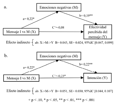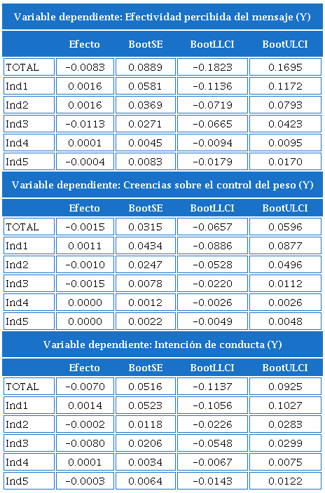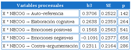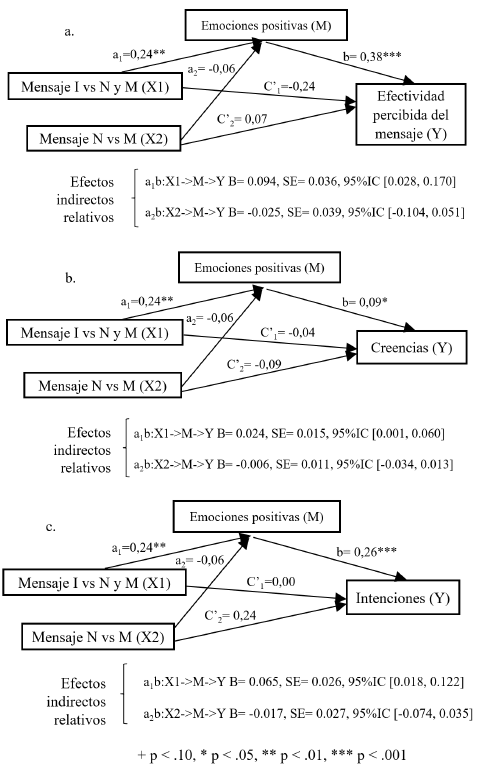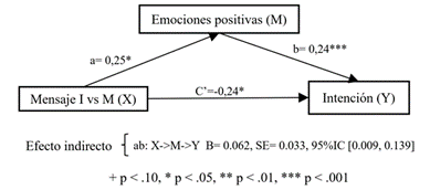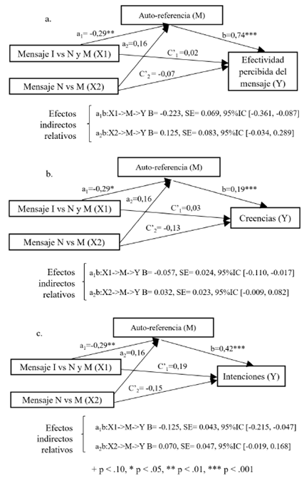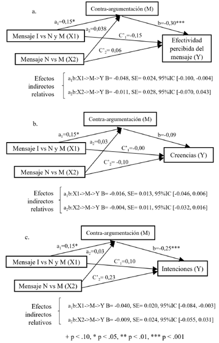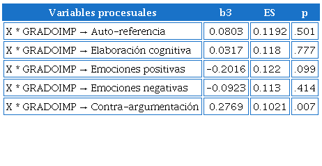 Las hipótesis de mediación (H1, H2, H3, H4 y H5) fueron contrastadas utilizando el modelo 4 de la macro PROCESS, mientras que la hipótesis H6 fue probada con el modelo 80. Aquí es importante recordar que en los análisis mediacionales con la macro PROCESS se considera un efecto indirecto significativo cuando el intervalo de confianza generado por las técnicas de bootstrapping no incluye el valor cero (0). Así, en el estudio los análisis mediacionales significativos se dieron con respecto los mediadores auto-referencia (H1), contra-argumentación (H3), emociones positivas (H4) (véase Tabla 2), tal como se muestra más adelante.
