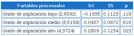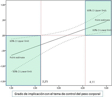 Finalmente, para contrastar la H7, “Las personas con una alta implicación personal con el tema del control del peso corporal serán más persuadidas por los mensajes que incluyen evidencia más explícita (informacional), mientras que aquellas con baja implicación personal serán más persuadidos por el mensaje que no la incluye, o lo hace de forma menos evidente (narrativo y mixto)”, se utilizó la macro PROCESS (modelo 1) (Hayes, 2022), no observándose ningún efecto de interacción significativo entre la variable independiente y la variable moderadora (implicación con el tema de control del peso), que arrojó valores de p >.05. Por tanto, se concluye que la implicación no actuó como una variable moderadora y se rechaza la H7.