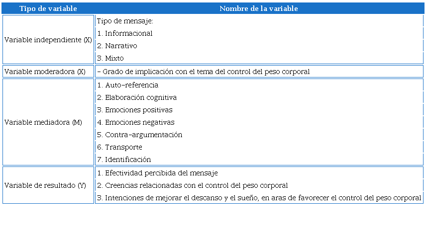 Este estudio se propuso analizar el efecto mediador de la identificación con el protagonista, el transporte narrativo, la contra-argumentación, la auto-referencia, las emociones y la elaboración cognitiva, y el papel de la implicación como variable moderadora, comparando los mensajes de persuasión informacional, narrativa y mixta. En la Tabla 1 se presentan las variables utilizadas.