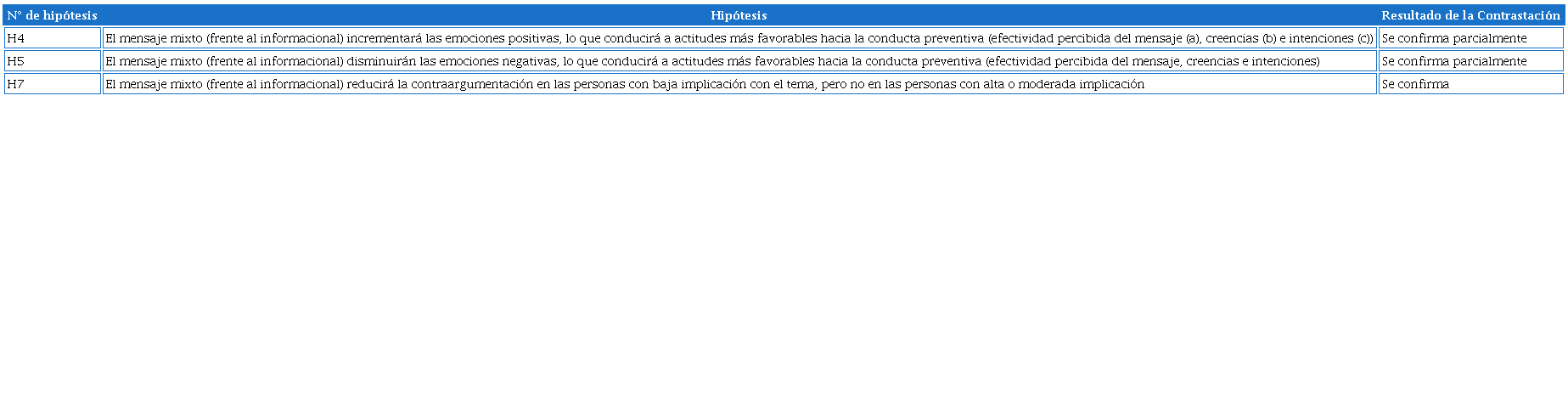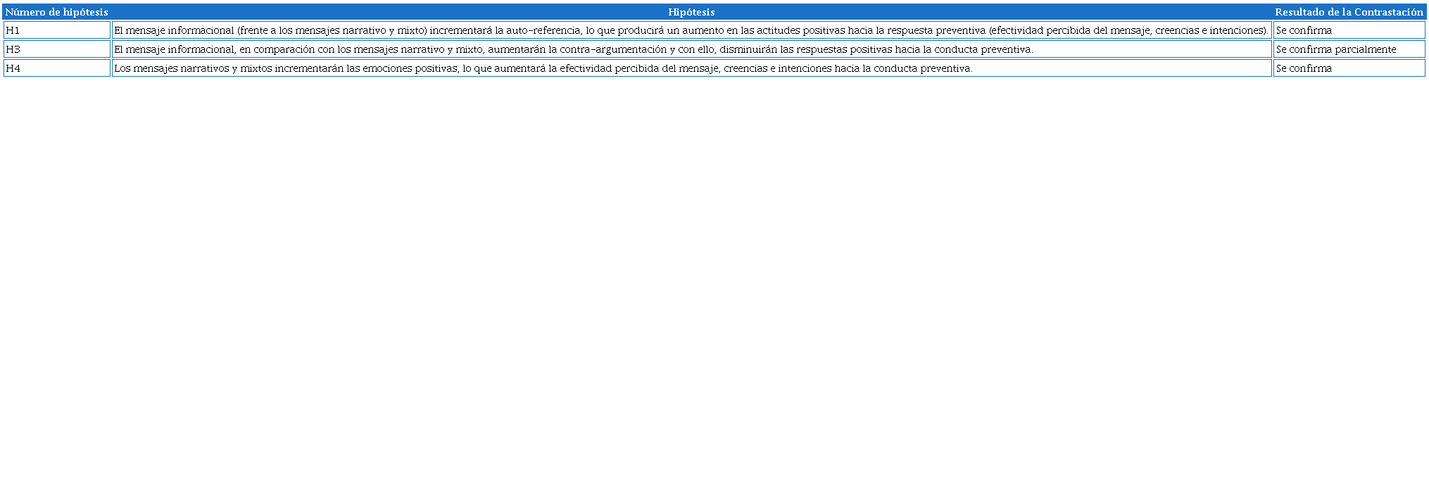 La hipótesis 1 planteaba “El mensaje informacional (frente a los mensajes narrativo y mixto) incrementará la auto-referencia, lo que producirá un aumento en las actitudes positivas hacia la respuesta preventiva: efectividad percibida del mensaje (a), creencias (b) e intenciones (c)”.