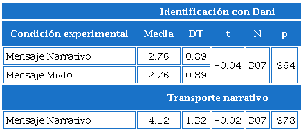 Al margen de la contrastación de hipótesis, llama la atención los resultados respecto a la identificación con el personaje tanto para el mensaje narrativo (M = 2.76, DT = 0.89), como para el mensaje mixto (M = 2.76, DT = 0.89), que además de ser prácticamente idénticos, se sitúan por debajo de la media teórica.