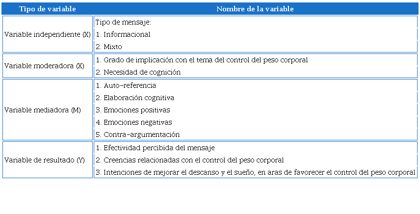 Este estudio se propuso analizar el efecto mediador de la contra-argumentación, la autoreferencia, las emociones y la elaboración cognitiva, y el papel de la implicación y la necesidad de cognición como variables moderadoras, comparando dos estrategias de persuasión: informacional y mixta. Para este estudio se analizó adicionalmente la variable moderadora necesidad de cognición, definida por Petty y Cacioppo (1984) como la tendencia a involucrarse y disfrutar de los esfuerzos cognitivos (gusto por pensar). Se consideró que esta variable puede ajustar la forma en que se procesan los mensajes, basado en las preferencias de los individuos respecto al esfuerzo cognitivo y que, por tanto, podría condicionar la valoración de su credibilidad, y, en definitiva, su efecto persuasivo (Baumeister y Vohs, 2007; Cacioppo y Petty, 1984). En la Tabla 5 se presentan las variables utilizadas.