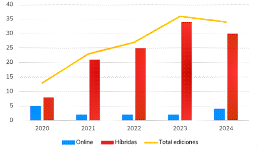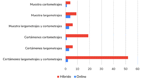 En cuanto al impacto que provocó la COVID-19, podría haberse pensado que en el 2020, dada la cancelación de la presencialidad en muchos festivales, estos eventos culturales se pasarían en masa al formato online, algo que no sucede. Los datos de este año son los más bajos de la muestra, pero, no obstante, resultan el punto de partida para el crecimiento de las modalidades híbrida y exclusivamente en línea en los años consecutivos. Por lo tanto, se seguiría la tendencia del incremento de usuarios de streaming y se constituiría en una nueva vía para dar a conocer de forma amplia los festivales, tradicionalmente limitados a su propio ámbito geográfico. No obstante, el punto de inflexión en 2023 promueve la continuación de la investigación sobre la conducta de dichos eventos cinematográficos en los próximos años.