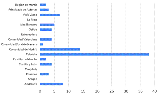 En lo que respecta a la distribución geográfica de los 96 festivales híbridos, se celebran en 13 de las 17 comunidades autónomas. Cataluña aglutina el mayor número, con 38 de ellos (39,6%) (Figura 2). Resulta relevante la considerable diferencia con las demás regiones, lo que puede resultar del hecho de que la plataforma Filmin tenga su origen y sede en esta comunidad autónoma. Por su parte, sigue Madrid con la celebración de 14 (14,6%) festivales híbridos, lo que puede resultar lógico atendiendo a su condición de capital política española. Sin embargo, el resto de festivales se dispersan entre el resto de comunidades autónomas, sin responder a factores que podrían ser determinantes como la densidad poblacional.