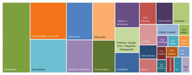 En cuanto a la temática de los festivales, en la Figura 4 podemos ver una gran diversidad. Los que más predominan son los generalistas, con un total de 16 festivales (14,6%) de una programación variada con diversos temas y visiones. Por otro lado, son 11 los festivales (10%) que se anuncian con una programación integrada por cine independiente y de autor. Es importante señalar que Filmin sigue desde sus comienzos una estrategia de marketing donde se autodenomina como la plataforma española que actúa como alternativa a las grandes superproducciones comerciales, como se destaca en uno de sus eslóganes de promoción: “Por eso existimos, para ser la alternativa” (Filmin, 2024). En este sentido, el Atlántida Film Fest se promociona también como un certamen de cine inédito e independiente. Le sigue el género documental, con 10 festivales (9,1%), y a continuación la animación con 8 festivales (7,3%). Entre las novedades del último año, destaca un festival dedicado a los trabajos realizados con inteligencia artificial.