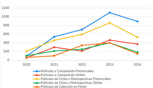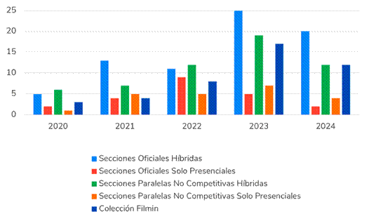En el periodo analizado entre 2020 y 2024, los festivales cinematográficos que acuden a una ventana de exhibición digital optan por la modalidad híbrida como la preferente en Filmin. Este fenómeno de hibridación supone una contribución decisiva para el desarrollo del streaming de cine, sin que los festivales más tradicionales se vean agredidos en su propia naturaleza presencial. Lo demuestra el hecho de que ninguno de los festivales nacidos presencialmente pasara a virtualizarse completamente, mientras que otros, nacidos en el ámbito digital, dejaran de celebrarse. Resulta, pues, más bien una muestra de la “cultura de la convergencia” (Jenkins, 2008), donde los viejos medios conviven con los nuevos.