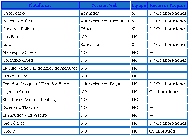 Por otro lado, Colombia Check y Cotejo carecen de estructura y llevan a cabo sus labores a través de otras entidades. Igualmente para La Silla Vacía, Escenario Tlaxcala, Ojo Público, y El Sabueso (Animal Político) a pesar de que realicen publicaciones educativas puntuales o solamente en sus redes sociales (ámbito no cubierto en este trabajo).