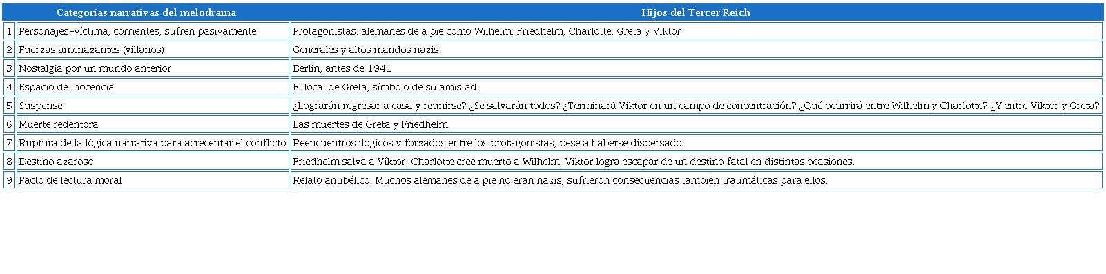 De lo descrito hasta aquí se desprende que la serie Hijos del Tercer Reich reúne las nueve categorías principales del modo melodramático señaladas más arriba, como muestra la Tabla 1.