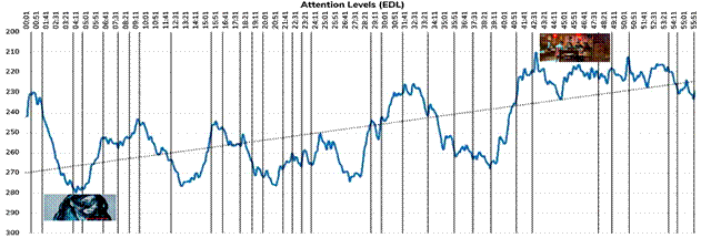 El gráfico 1 refleja que los niveles de atención sufren importantes incrementos y descensos a lo largo del visionado del capítulo (los minutos y segundos se muestran en el eje X; se ha delimitado el comienzo y final de las escenas con líneas verticales). Las cifras representan la resistencia electrodérmica de la piel capturada por sensores digitales minuto a minuto.La curva de EDL (de trazo continuo y en azul) es muy dispersa respecto de la línea de tendencia (en puntos suspensivos), lo cual es normal cuando predominan las escenas de intriga y acción.
