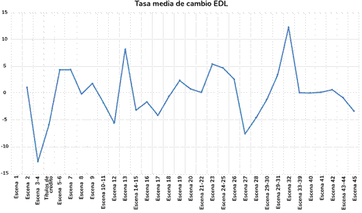 Este gráfico permite detectar qué escenas contribuyen a incrementar y a disminuir los niveles de atención de la audiencia. En este sentido, las escenas que tienen una tasa de cambio más negativa son la 3-4 y la 27. En las escenas 3-4, arranca la trama principal y se presenta a los protagonistas, y lo hace en el momento de menor interés de la serie. En la número 27 del capítulo, Ana Tramel recibe una misteriosa llamada anónima que le informa de que el hermano estaba en terapia por su adicción su juego. Si bien es cierto que esta escena contribuye a disminuir el nivel de atención, al presentar una de las tasas de cambio de EDL más negativas, destaca como el momento narrativo a partir del cual se produce el mayor crecimiento de los niveles de atención. Finalmente, llama la atención que la última escena (45) presente una tasa media de cambio de la EDL negativa, cuando se trata de un momento dramático álgido al coincidir con un punto de giro de la serie, pues en ella, Ana se entera de que su hermano se ha suicidado en la cárcel. El motivo del descenso se debe a que, tras el trágico desenlace, el capítulo incluye casi un minuto final de imágenes que no contribuyen significativamente al avance de la historia.