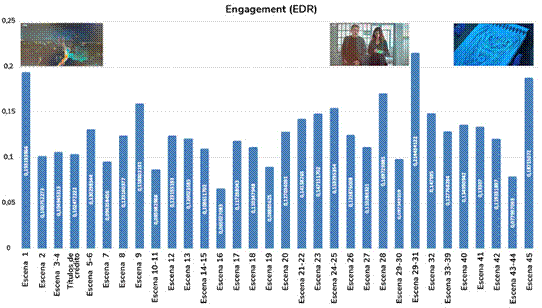 A continuación, nos vamos a centrar en el análisis del nivel de engagement (EDR) o conexión emocional, que muestra los cambios súbitos en la resistividad de la piel provocados por reacciones a estímulos concretos de la serie. Cuando esa alteración es de mayor magnitud, se considera que el elemento de la ficción que lo ha provocado es emocionante y que, por tanto, genera un instante de engagement.