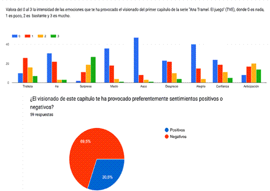 Del análisis de todo ello, se obtiene la respuesta inconsciente de la audiencia. Para completar esta información y poder contrastarla con la respuesta consciente, los participantes respondieron, inmediatamente después del visionado y en la misma sala de la proyección, un cuestionario online sobre hábitos de visionado y sobre qué emociones les había suscitado tanto el capítulo como cada uno de los personajes principales. También manifestaron si estas emociones producían sentimientos positivos o negativos, información no aportada por la tecnología empleada. Para esta parte de la investigación, se ha seguido la clasificación de emociones básicas de Paul Ekman (1972 y 2007).