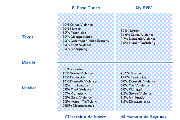 Both a quantitative and qualitative content analysis were performed on the news of the El Mañana de Reynosa (Mexico), El Heraldo de Juárez (Mexico), El Paso Times (Texas) and My RGV (Texas) news organizations on the border of the United States and Mexico. The Reynosa newspaper, in Tamaulipas state of northeast Mexico, was founded in 1947 and is across the border from Texas’ Rio Grande Valley, where My RGV, the largest news organization in the area, is located. My RGV is a collective of three newspapers: The Valley Morning Star (founded 1909 in Harlingen, Texas), The Monitor (founded 1909 in McAllen, Texas), and The Brownsville Herald (founded 1892). The Juárez newspaper is located in Ciudad Juárez, Chihuahua state, which is across the Rio Grande (a.k.a. Rio Bravo) from El Paso in southwest Texas. El Heraldo is a national Mexican newspaper founded in 1965 and the edition we analyzed focuses on Juárez. The El Paso Times (founded in 1881) is the largest news organization in the El Paso area. During a three-month period (October, November, and December 2023), the authors, fluent in English and Spanish, collected news stories in English from the two Texas newspapers: 35 from the El Paso Times and 29 from My RGV. Stories were collected in Spanish from two Mexican newspapers: 128 from el Heraldo de Juárez and 39 from El Mañana de Reynosa.