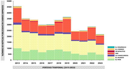 Para iniciar el análisis, se establece la distribución de las publicaciones a lo largo del periodo de estudio (2013-2023) y entre los diferentes periódicos incluidos en la investigación.