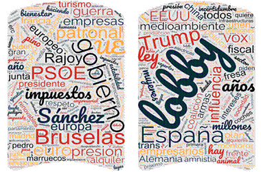 Atendiendo al análisis de la frecuencia terminológica, las noticias a menudo contienen palabras que las enlazan con la política (véase Figura 2). Se mencionan repetidamente nombres de representantes públicos y partidos, como “Rajoy”, “Sánchez”, “PSOE” y “Vox”, además de términos que remiten a la escena política internacional, como “Bruselas” y “Europa”. Se detecta también un número significativo de términos que apuntan a legislación y finanzas, como “impuestos” y “ley”, junto con vocablos del terreno económico como “empresas” y “Euro”. Las referencias a problemas sociales son menos comunes.