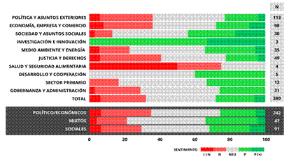 Es importante destacar que en ciertas partes de los resultados se adopta una clasificación más generalista de los intereses tratados en las publicaciones, dividiéndolos en tres macro categorías: intereses político-económicos (ID 01, 02, 10), intereses sociales (ID 03, 04, 06, 07, 08) e intereses mixtos (ID 05, 09). Se emplea en determinadas circunstancias con la finalidad de exponer de manera amplia las tendencias observadas.