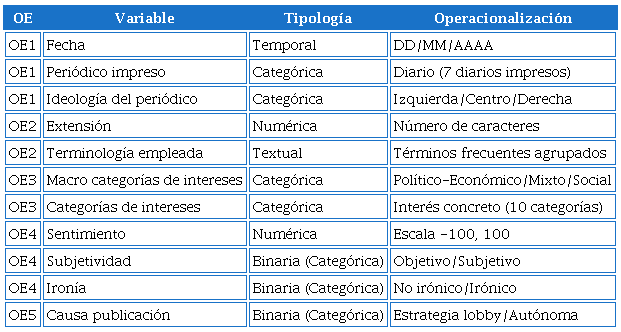 Las variables correspondientes a la fecha, el periódico en el que se publica la noticia, el ámbito geográfico de cobertura y la extensión en caracteres del contenido no necesitan aclaración, ya que se obtienen de manera directa del propio artículo. Sin embargo, el resto de las variables requieren puntualizar las herramientas metodológicas que se emplean.