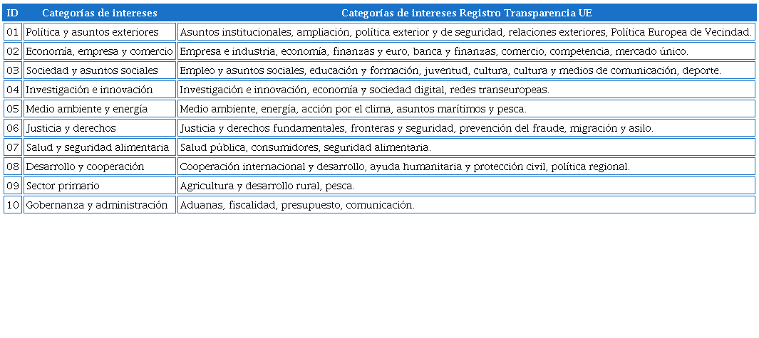 La identificación de los intereses predominantes se realiza mediante la clasificación de las noticias en una variable categórica. Para establecer las categorías de intereses, se utiliza el Registro de Transparencia de la Unión Europea (2024), que enumera 40 tipologías de interés. A fin de simplificar el análisis y mejorar la claridad de los resultados, estas tipologías se han consolidado en diez categorías (véase Tabla 2).