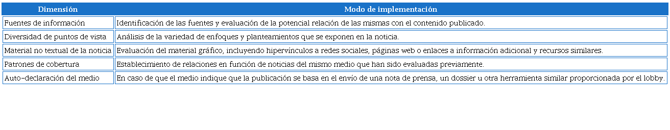 El modo de implementación de cada dimensión se define en la Tabla 3.