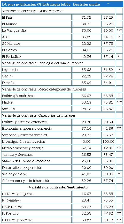 Otro aspecto diferencial deriva de la propia dinámica comunicativa de los medios. Las actividades de los lobbies se distinguen entre directas, cuando se dirigen a los tomadores de decisiones sin intermediarios (Chalmers y Macedo, 2021; Colli y Adriaensen, 2020), e indirectas (grassroot lobbying), cuando la ciudadanía o los medios de comunicación actúan como enlace en el proceso de influencia (Grose et al., 2022). Por consiguiente, al valorar la cobertura mediática de estos grupos, resulta crucial discernir si la difusión de cierta información es resultado de una acción espontánea por parte del medio, o si está vinculada a una estrategia de lobby indirecto.