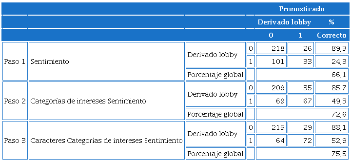 En última instancia, se implementa un Modelo de Regresión Logística Binaria (RLB), adecuado para predecir la probabilidad de un resultado determinado, basándose en varias variables predictoras (Peng et al., 2002). Este método se utiliza para evaluar si la publicación de una noticia puede atribuirse a una estrategia de lobby indirecto, considerando un conjunto de variables explicativas. La ecuación que define el modelo es: