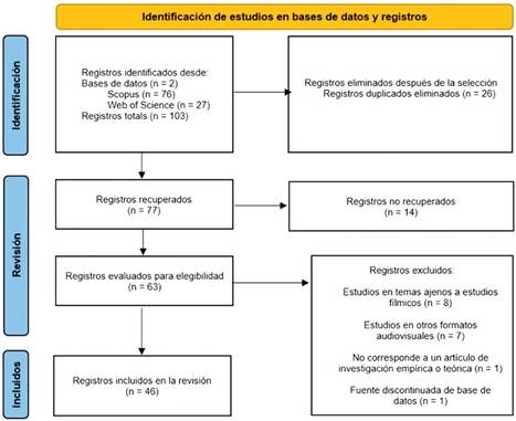 La siguiente fase de la revisión supuso una lectura detallada y manual de los registros encontrados en ambas bases de datos (ver Figura 1). La lista de documentos encontrados ascendía a un total de 103 registros. De estos, 76 provenían de Scopus y 27 de Web of Science. La revisión manual identificó que 26 documentos eran duplicados, dejando una cifra de 77 restantes; de estos, 14 no pudieron ser recuperados por medios tradicionales. Aplicando los criterios de elegibilidad, 8 fueron descartados por que investigaban objetos de estudio ajenos a los Estudios Fílmicos, 7 abordaban otros formatos audiovisuales no cinematográficos (televisión, medios digitales, videoclips), 1 no correspondía a un artículo de investigación empírica o teórica, y 1 provenía de una publicación discontinuada de las bases de datos. El total de registros seleccionados para revisión finalizó con 46 documentos (n = 46).