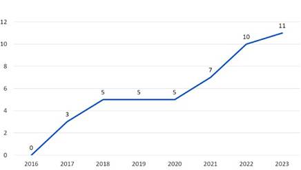 Un detalle no menor emerge cuando se atiende a la distribución de los estudios según el año. Como lo expresa la Figura 2, desde el año 2017 en adelante se ha tenido un aumento considerable de publicaciones sobre temas de cine en entornos académicos: 3 en 2017 (6.52%); 5 en 2018, 2019 y 2020 (10.87% respectivamente); 7 en el 2021(15.22%); 10 en el 2022 (21.74%); y 11 en el 2023 (23.91%).
