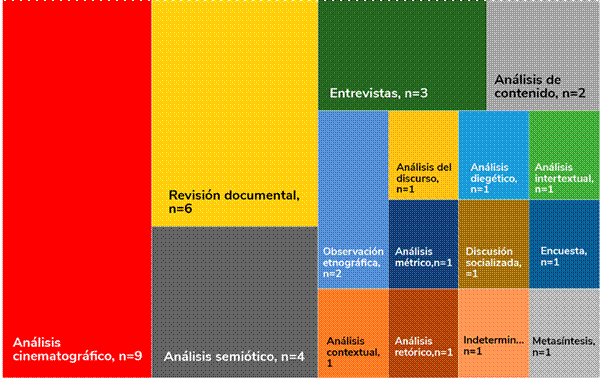 Aquí las tendencias son claras: el 25% (n=9) realiza un estudio de los componentes formales del discurso audiovisual, razón por la cual se ha catalogado como ‘análisis cinematográfico’. Existen investigaciones de corte textualista que describen de un modo diferente su método: ‘análisis semiótico’ con 11.11% (n=4) o ‘análisis de contenido’ con 5.56% (n=2) lideran este grupo. Otros métodos incluyen los análisis de tipo ‘retórico’, ‘métrico’, ‘discursivo’, ‘intertextual’ y ‘diegético’, todos con el 2.78% de los registros (n=1).